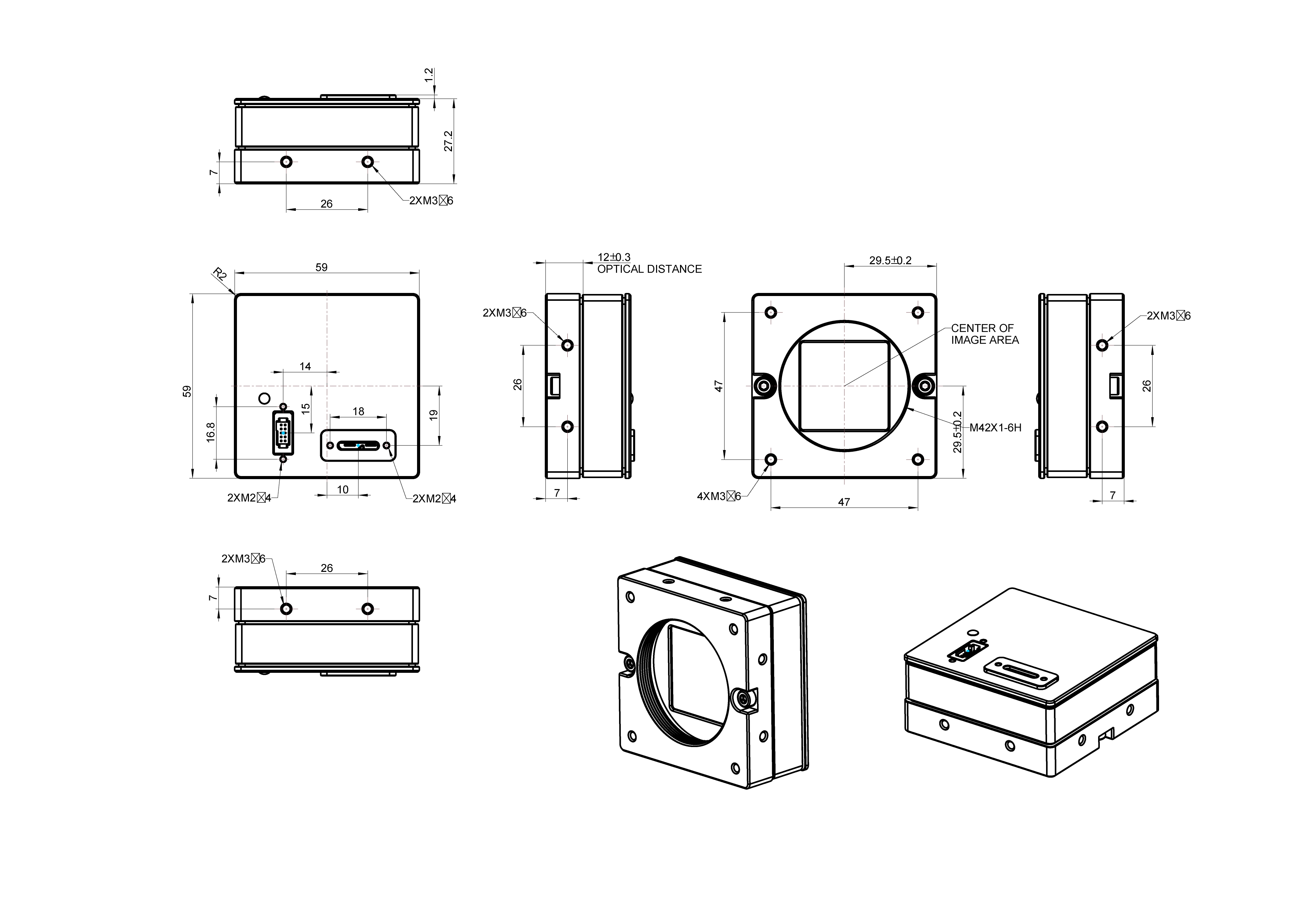 Dimensions overview for IUD Series large-format NIR industrial cameras