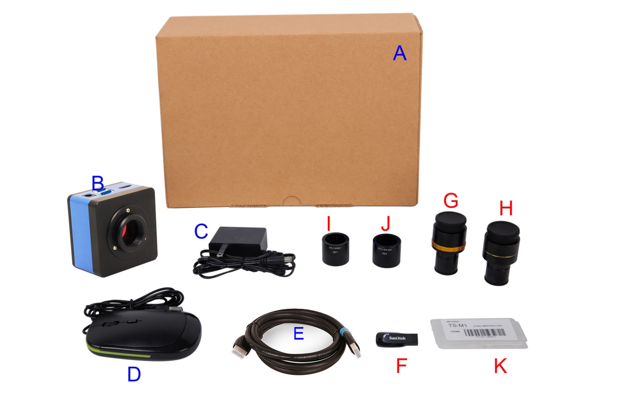 Before powering on, ensure the HDMI cable is firmly connected (E) and only insert verified, high-speed USB flash drives (F) to avoid recording errors. Store all accessories in the protective box (A) to prevent transit damage.