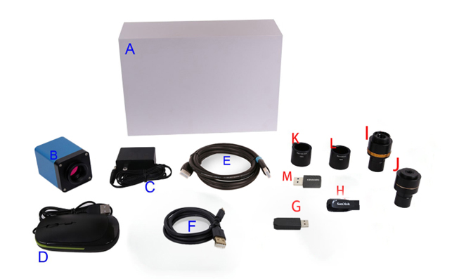 - G Optional accessories: voice control module, USB drive, WiFi adapter, eyepiece tube adapter, etc.