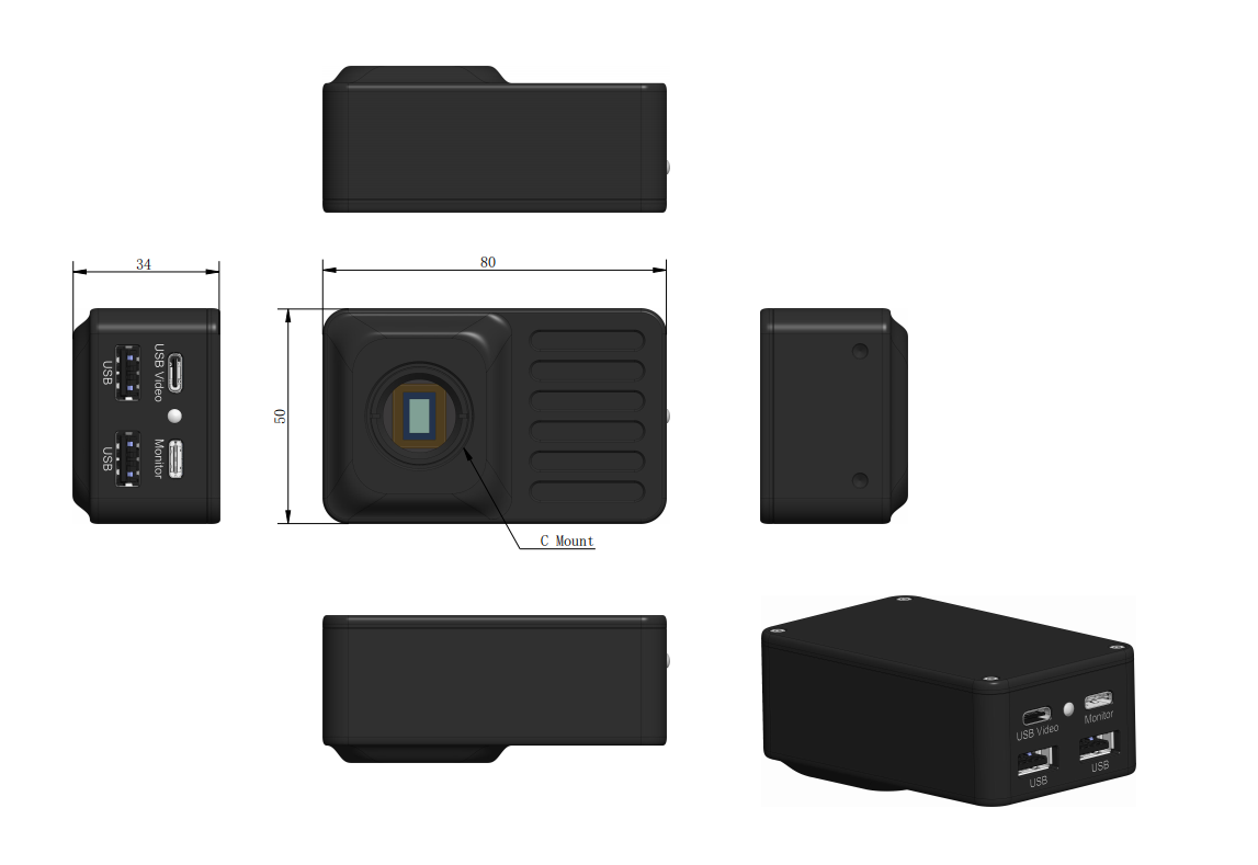 2.0 µm × 2.0 µm | 8 MP (3840×2160) | Monitor: 30 fps @ 3840×2160; USB Video: 30 fps @ 3840×2160; Wi-Fi: 30 fps @ 3840×2160 | Type-C Monitor USB Video Wi-Fi | C-mount | USB flash drive | 1364 mV ultra-high light sensitivity (1/30 s) 0.15 mV low dark current (1/30 s) Sony Starvis 2 technology Plug-and-play Type-C connectivity Supports multi-camera networking Layered/fused measurement data storage | |