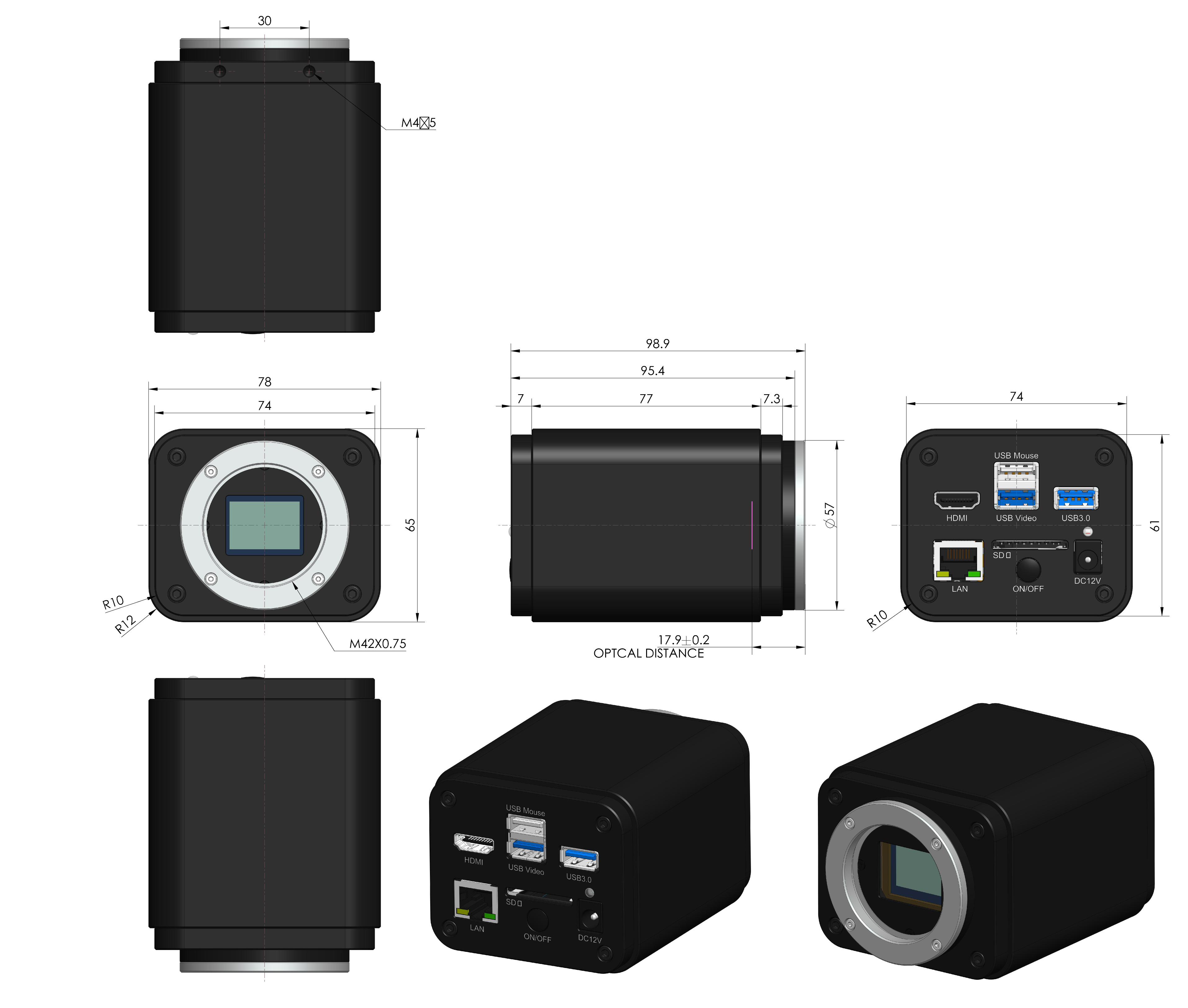 HDMI2.0 USB3.0 LAN Wi-Fi | M42×0.75 (C-mount adapter optional) | SD Card / USB Flash Drive | 22 MP high resolution imaging 4K/1080P HDMI synchronous output Multi-platform software support (Windows, macOS, Linux) Supports live streaming/remote control/multi-terminal access SD card/USB drive local image and video storage | |