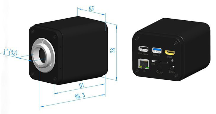 2.0 µm × 2.0 µm | 8MP (3840×2160) | HDMI: 60 fps@4K/1080P; NETWORK: 30 fps@4K/1080P; USB: 30 fps@3840×2160 | HDMI2.0 USB3.0 Ethernet Wi-Fi | C mount | SD card / USB drive | 4K video recording Image measurement Crosshair display Picture-in-picture function Image comparison 3D noise reduction Sharpening processing ROI white balance Multi-language menu | |