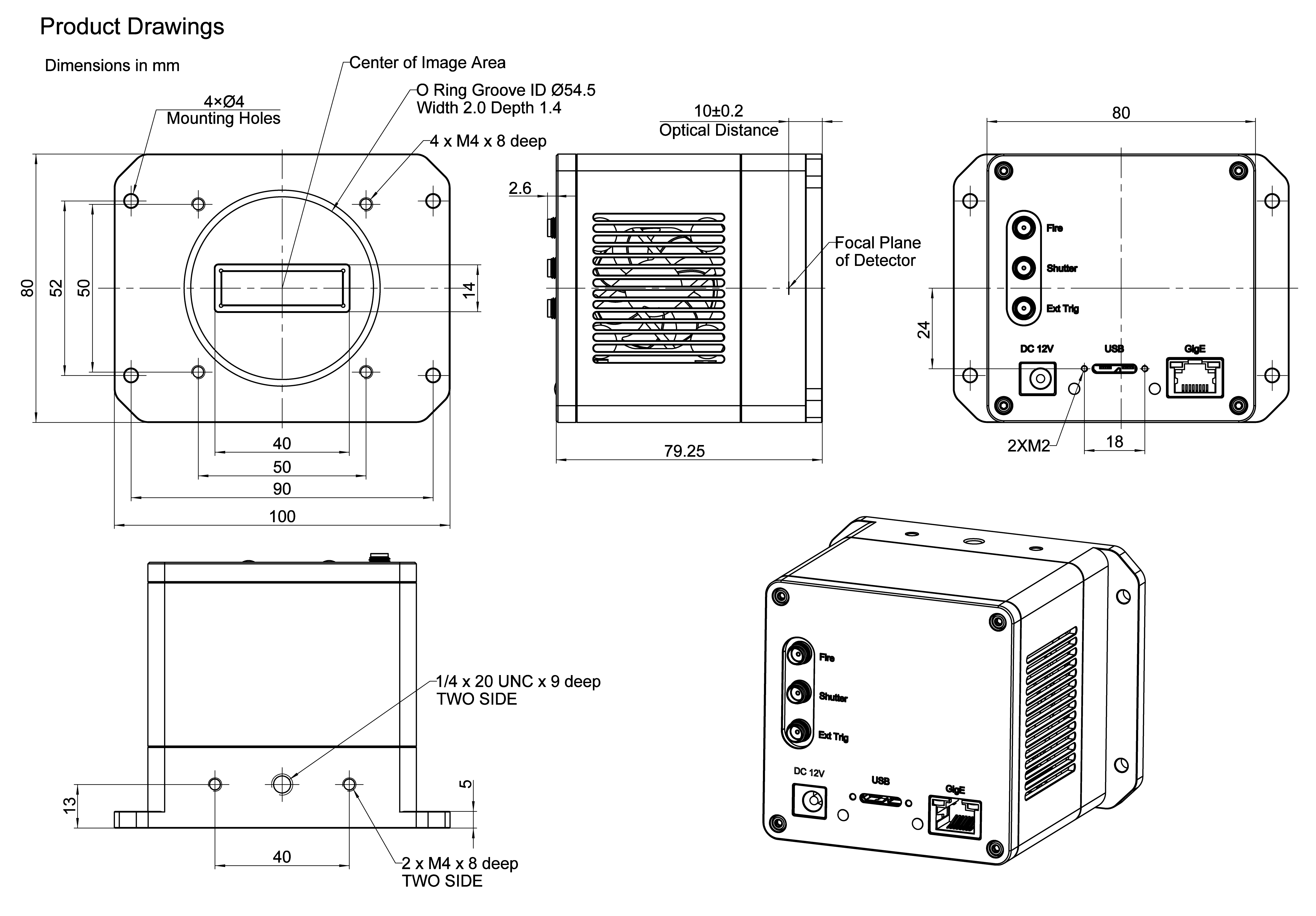 Mechanical dimensions reference for the sCCD01AM Series thermoelectrically cooled sCCD scientific cameras.